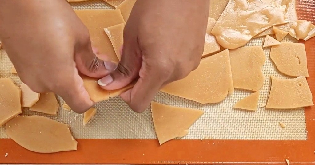 - Once mixture reaches the correct temperature, pour quickly on to a lined baking pan with silicone mat or parchment paper. Move quickly.