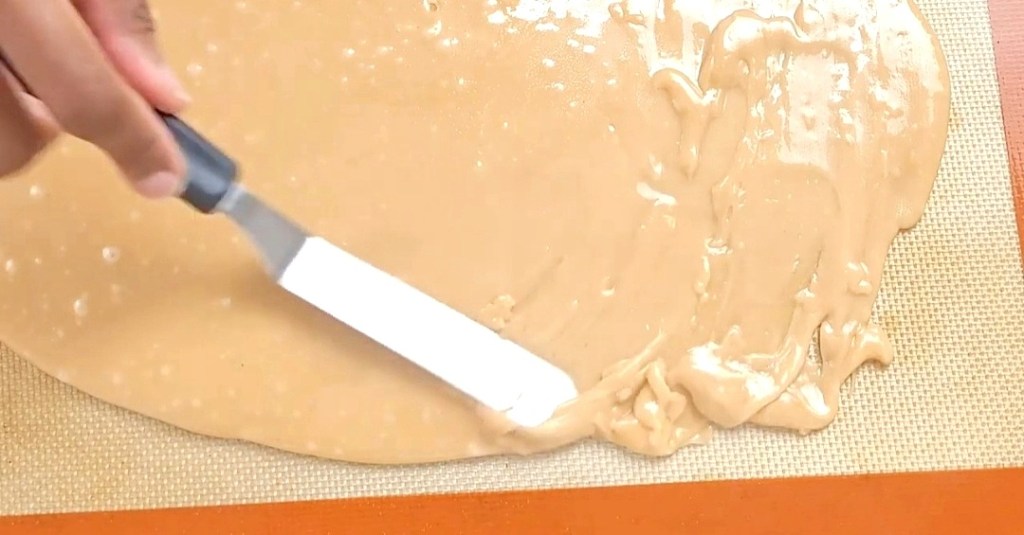 - Use a offset spatula to spread thinly, do this quickly because mixture hardens fast.