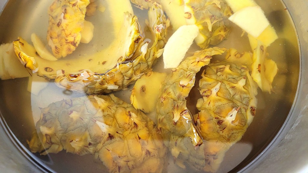 - Bring ginger and pineapple skin to a boil in 8-10 cups of water (more depending on how big your pot is) for 30 mins on medium heat.