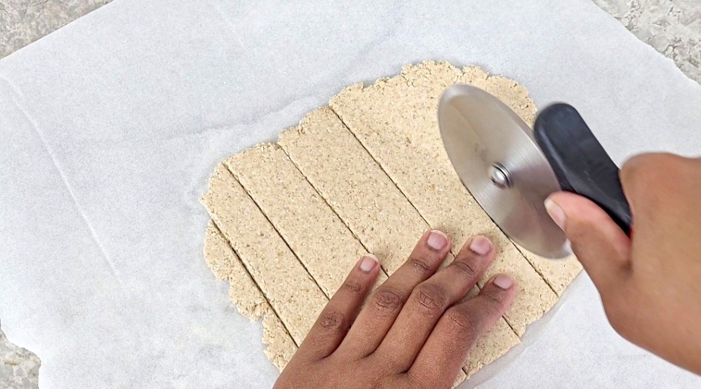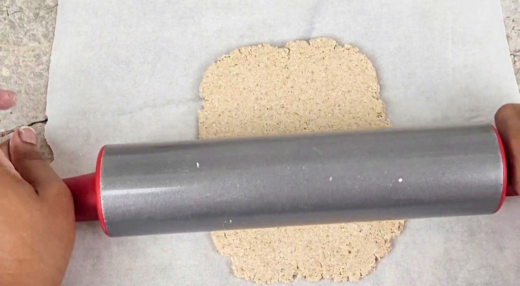 - Roll dough as thinly as possible (see video) roll it between 2 sheets of parchment paper (this is to prevent dough from sticking to rolling pin.)