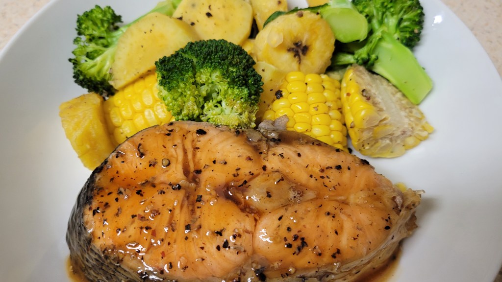 I also need to add I am not a fancy food eater lol, meaning I like what I like and eat what I like, and buy what I like lol then add a little razzle dazzle in the mix every now and then. My first trip of the month was at Seasons. It was salmon with broccoli corn, plantain, and sweet potatoes with teriyaki sauce. Very simple yet yummy meal.