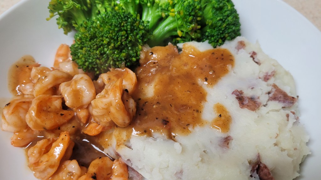 BBQ shrimp with mashed potaoes and broccoli