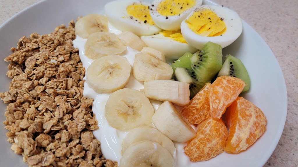 Cereal with hard boil eggs and fruits