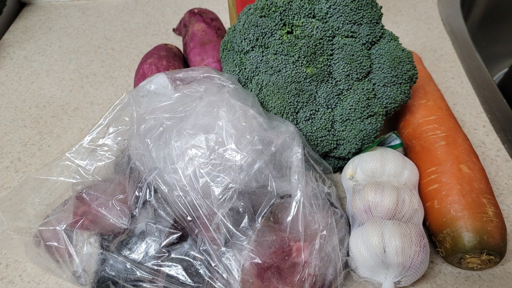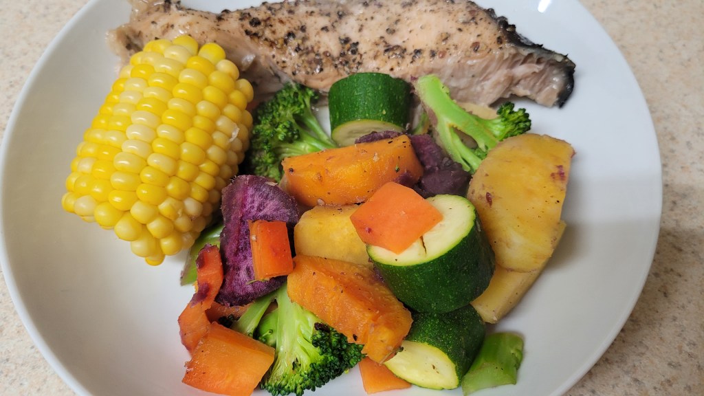 So, as you know, I visit Seasons Food Mart to get salmon as I can get reasonably sized salmon for a decent price. I mean sometimes I can get a salmon tail for $8.00 and sometimes I can get salmon steaks for about $11. It all depends on the day and price, like I said it’s always a surprise when I got shopping lol. This trip like many others lol I was able to grab 1 carrot, 4 different types of sweet potatoes (because sweet potatoes are LIFE lol), a 5pk of corn, a zucchini, and a lemon. All basic ingredients but since I have salt and pepper at home, I was not worried lol. I basically cooked all my veggies in a post and seared the salmon in its own oil with salt and pepper. The ingredients for this trip cost me $18.75.