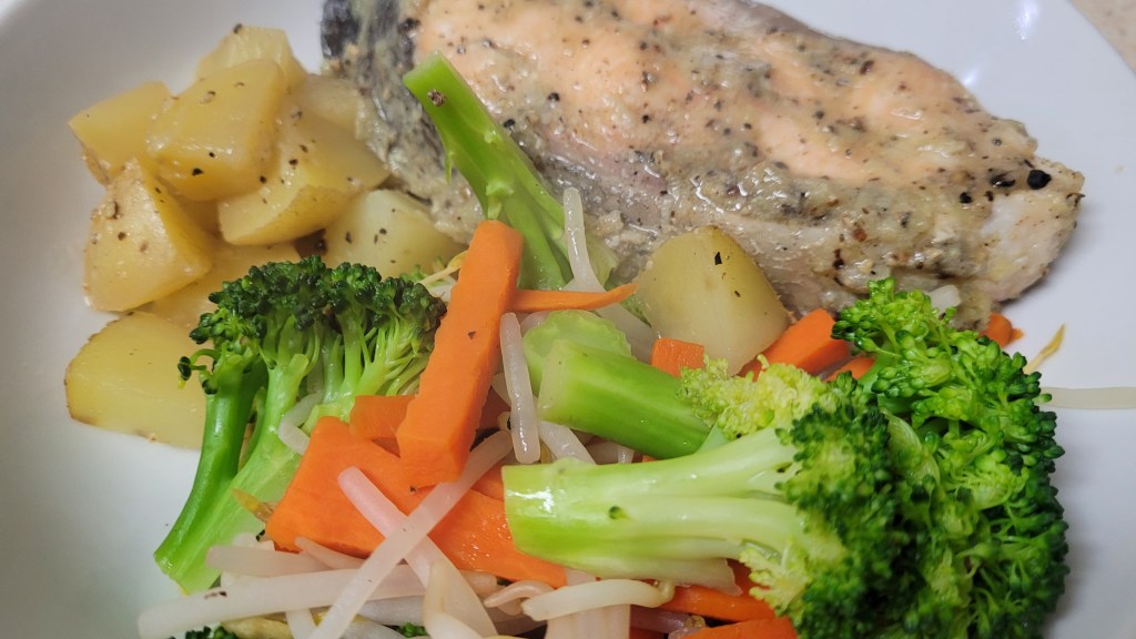 While at Seasons I grab some more salmon because the more salmon I have for the month the better I’ll be. This month the salmon was a little on the pricy side because this trip like the last the salmon cost $15.10 and that really eats into my entire $20 so it can become hard when that’s more than half the budget. I was able to grab 2 potatoes, a carrot, a 3-pk of garlic and bean sprouts. I steamed the carrot, broccoli, and bean sprouts together, and baked the salmon with the potatoes. It really was a light and healthy meal that took about 20 minutes top to prepare. This trip cost me $19.82.