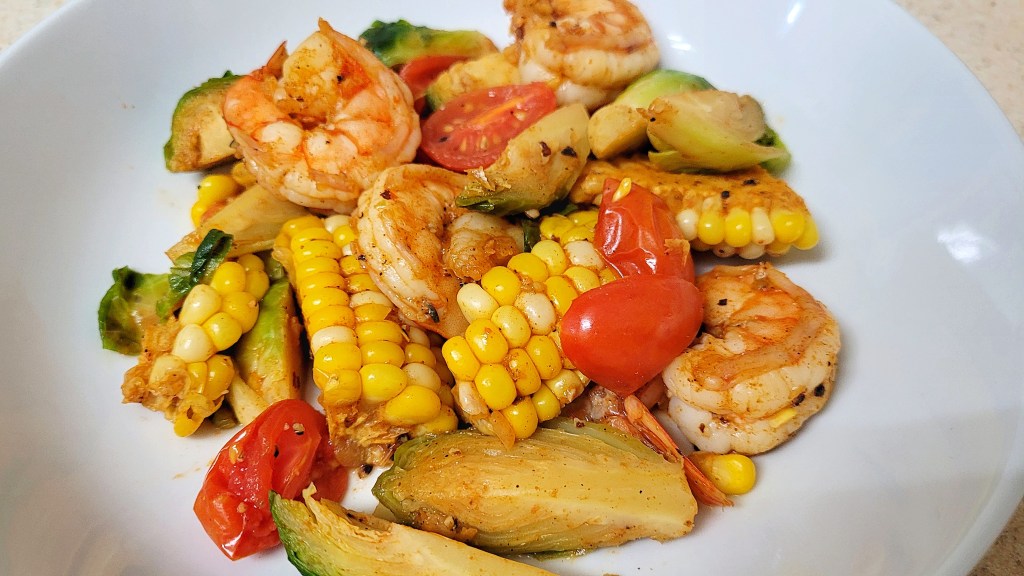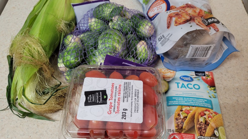 When I started this challenge, I really used to compare prices are different stores to determine which store I would purchase items from but as inflation happened, I just winged it lol literally. I have an idea of what I want to eat and shop accordingly. So, with that being said I visited Walmart twice for dinner items, before entering the store I really had an idea of what I wanted to eat but when I got there things changed as I shopped lol. My first trip at Walmart cost me $19.58 and I was able to get five items. There is not a name for the meal I created but it was shrimp and veggies. I was able to get corn, brussels sprouts, shrimp, grape tomatoes, and taco seasoning because what else am I going to season my meal with. I enjoyed eating this meal because it was light and very quick to prepare.