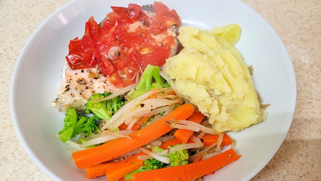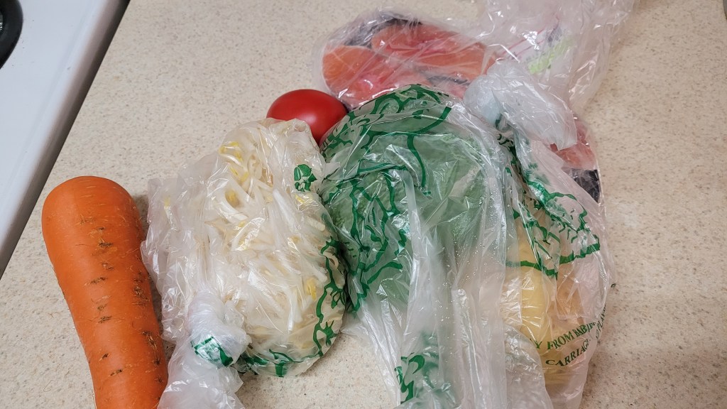 As you know, I visit Seasons Food Mart for the salmon, and sometimes their veggie selection because I can get veggies here at a reasonable price. My first trip at Seasons cost me $16.39 and I was able to get six items which included carrot, bean sprouts, broccoli, a tomato, and a potato. While I was walking in the store, I noticed the bean sprouts and decided to pick some up and build my meal around it along with the salmon. I made mashed potatoes, steamed veggies, and baked salmon. I was not confident on how I would create the meal, but it worked and surprisingly delicious.