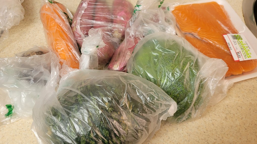 My next visit to Seasons I spent $18.37 and got ten items and that was after I went back to the car and contemplated my decisions lol. I was able to get salmon fillets, broccoli, squash, a carrot, a beet, and a whole bunch of sweet potatoes. When I picked up the beet I had no idea what I was thinking but I got it. The meal was quite simple, steamed veggies and salmon seasoned with salt and pepper. The good thing about this trip, I was able to get multiple portions (like my other trips) but I had veggies to last me for a while.
