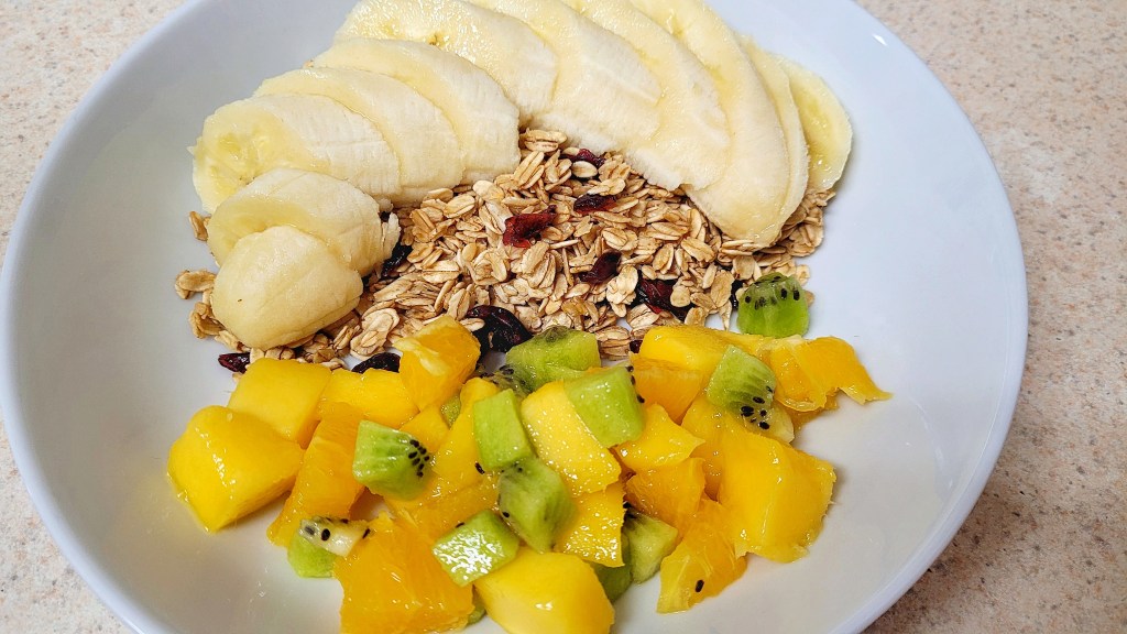 My final trip for the month was to the Real Canadian Superstore and I spent $19.09 and was able to get seven items to create my breakfast. I don’t always like eating eggs or yogurt for breakfast so this time around I kept in simple. I was able to get bananas, a mango, a kiwi, an orange, craisins, maple syrup and a big ole bag of oatmeal. I made granola with a fruit salad and banana on the side. Simple and filling. As always, I love having enough fruit to last me at least 2-3 weeks into the month and the best way for me to do that is to create a fruit salad and to freeze some depending on the fruits I have purchased. This month my fruit salad didn’t really last as long as I intended but with the bag of oatmeal, I was able to make oatmeal, pancakes and granola throughout the month especially since I had maple syrup.